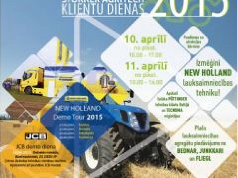 10. aprīlī no plkst. 10.00 līdz plkst. 17.00 un 11. aprīlī no plkst. 10.00 līdz plkst. 16.00 būs iespēja apskatīt NEW HOLLAND lauksaimniecības traktorus, lielāko PÖTTINGER tehnikas klāstu Baltijā un TECNOMA miglotājus, kā arī plašu lauksaimniecības agregātu piedāvājumu no BEDNAR, JUNKKARI un FLIEGL.